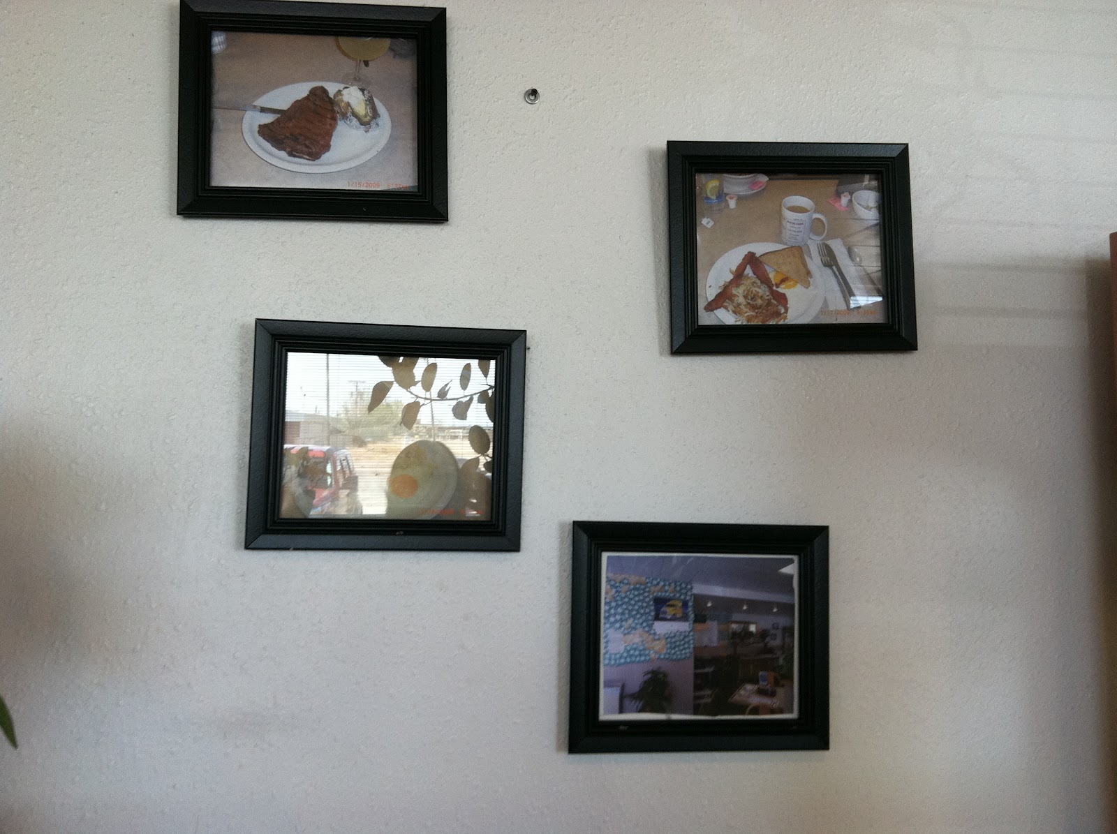 | For wall decorations, they had this assortment of low quality photographs of their food, hung slightly crookedly on the wall. |