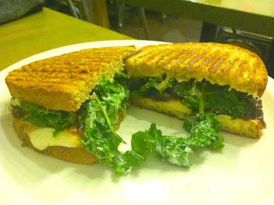 October 2012's Guest Sandwich - Pear fig chutney, fresh mozzarella, raw kale, and lemon garlic aioli, pressed. Full for $8.75 and half for $5.75 |